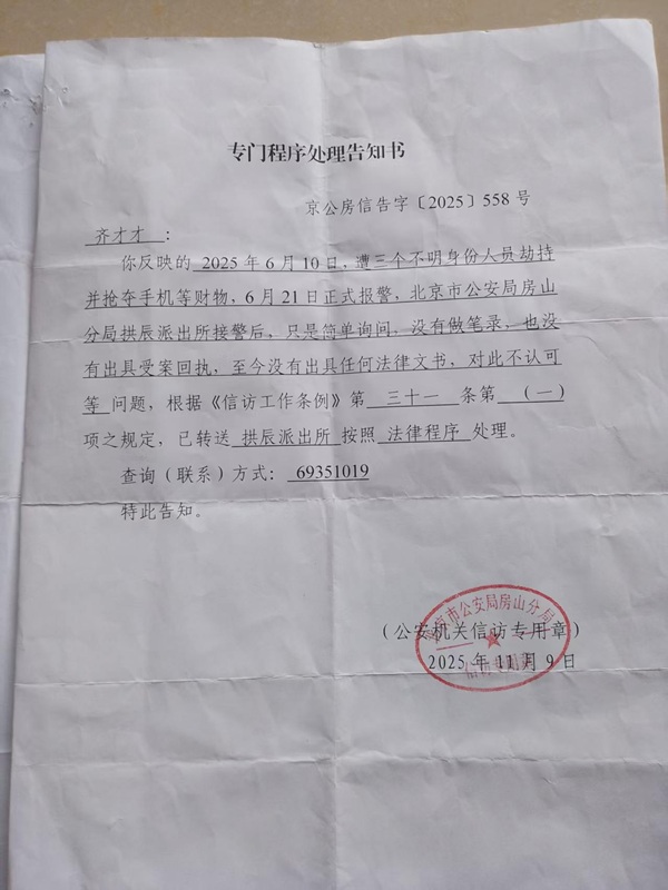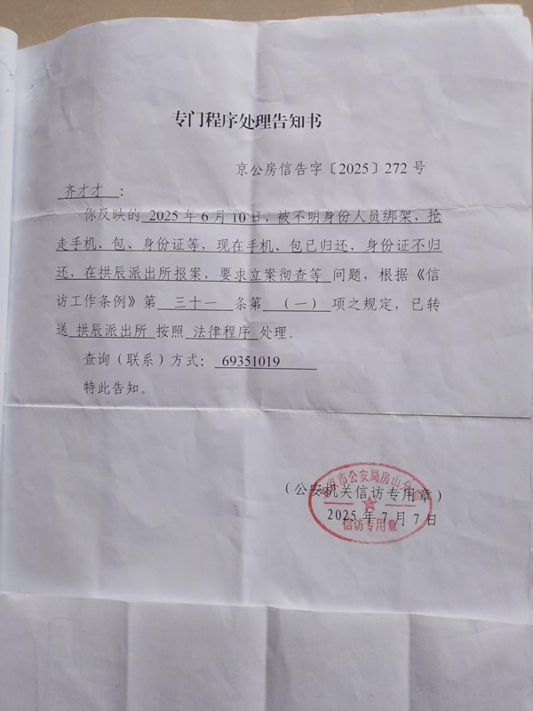 齐先生反映,此后他向房山分局说明了拱辰派出所未按规定处理的情况。他提供了一份落款日期为 2025 年 7 月 7 日、由北京市公安局房山分局 出具的《专门程序处理告知书》,告知书内容为要求其按法律程序办理。齐先生表示,当他依据此告知书要求拱辰派出所出具相关书面材料时,未得到办理。