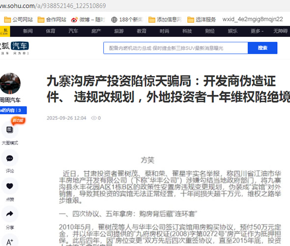 3、产权证“阴阳属性”:2025年5月,投资人在九寨沟县住建局查实,华丰公司未提交《规划验收合格证明》《公共设施移交证明》等办理产权证的必备文件,但其拿到的产权证却标注用途为“商业(宾馆)”,实质仍为“商住楼”——这一“怪胎”产权证,被指是开发商勾结相关部门违规操作的结果。