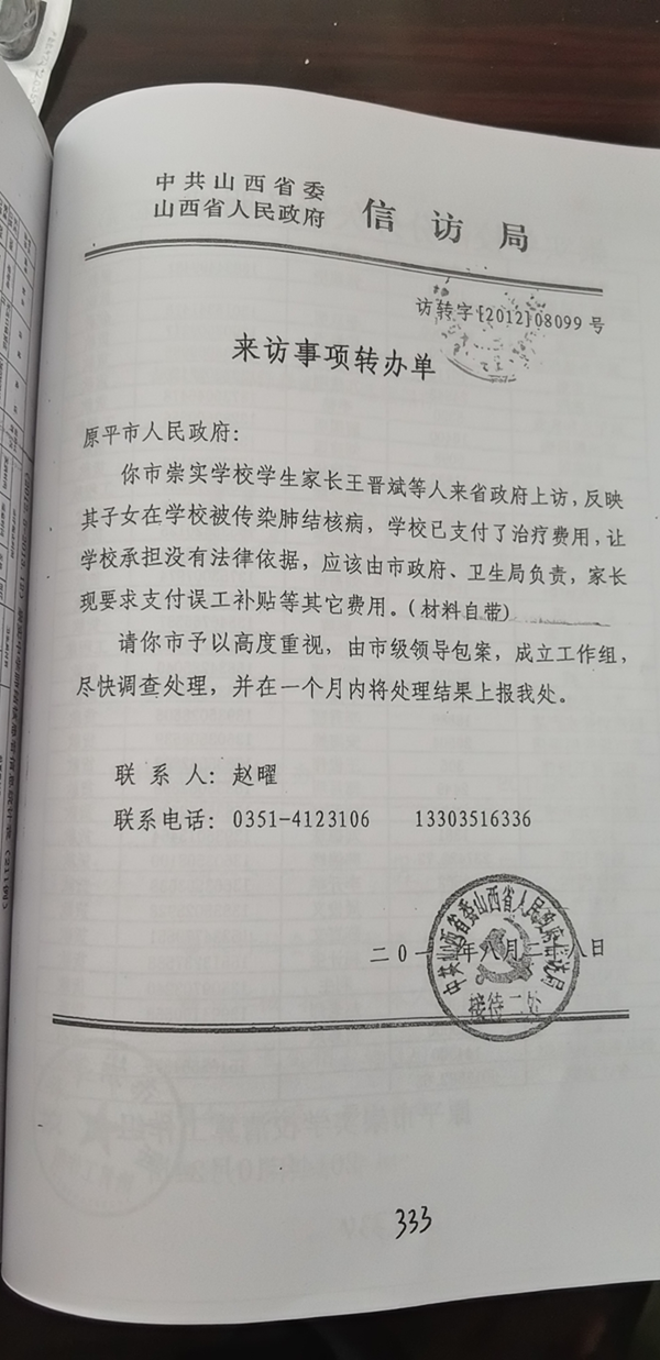 2012年5月我校发生肺结核疫情,国家与省级权威早已盖棺定论,可原平司法机关却视若罔闻!