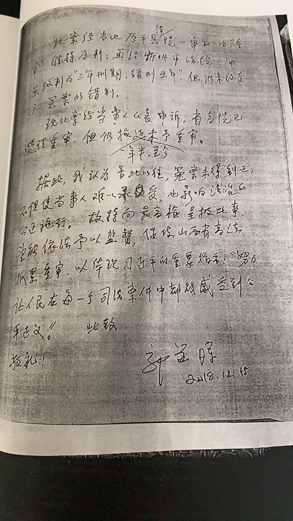 十二年了!我的学校被非法关停,3500名师生被迫离散;我的家庭被摧毁,儿女跟着我坐牢;我在狱中两次脑出血、一次脑梗、做过大手术,已下了病危通知书,差点没能活着出来!我从一个投身教育五十多年的老党员,变成了一个“罪犯”,影响了三代人,3500余名学生的名牌学校被强制关停,老百姓叫苦连天、怨声载道,给原平市人民制造了一个大悲剧——这十二年的冤屈,我咽不下!死也不会瞑目!